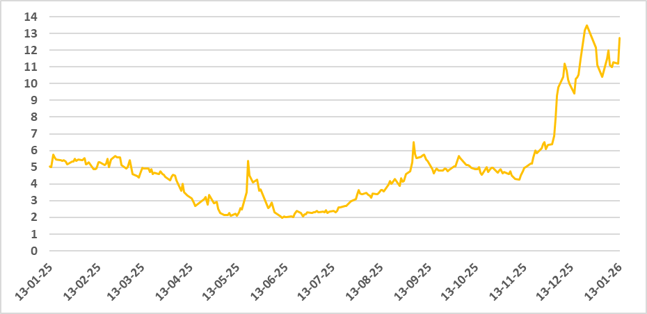 Curasights aktiekurs har været meget volatil over det seneste års tid, hvor særligt kapitalrejsninger og forventningerne dertil har skabt store op- og nedture. Siden Curasight fik finansieringen på plads i sommeren 2025 er aktien steget over 500%, hvilket afspejler en markant forbedret holdning til aktien.